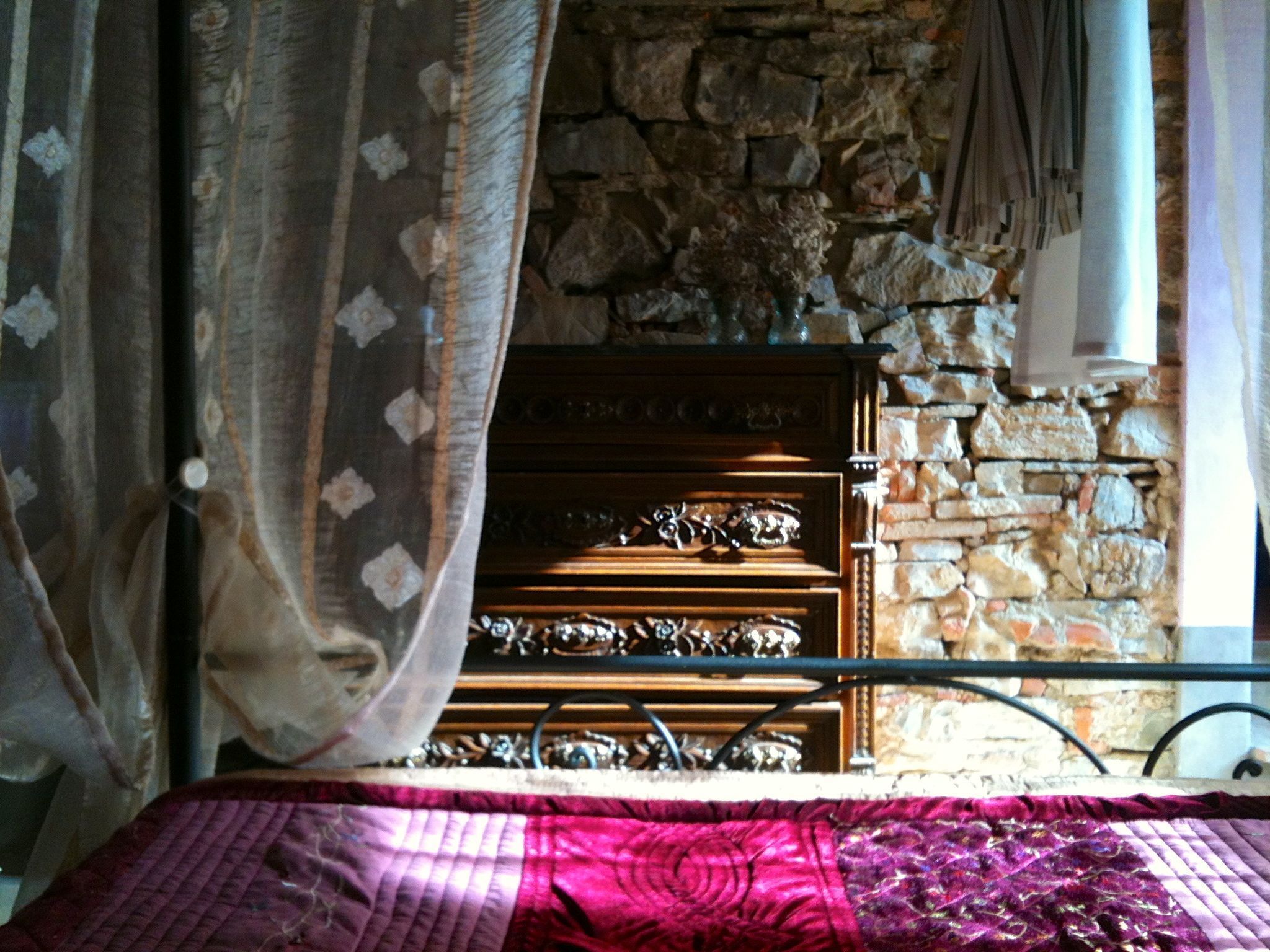 Über 3 Stufen gelangt man zu einem Doppelzimmer, mit Doppelbett mit Baldachin und Möbeln aus dem Familienbesitz, die aus dem späten 19. Jh. stammen.