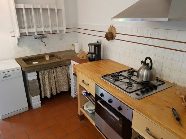 Die Küche ist vollständig ausgestattet mit Spülmaschine, Herd, Ofen, Kühlschrank und Mikrowelle. Das originale Spülbecken aus Stein ist Jahrhunderte alt. Alles, was zum Kochen benötigt wird, ist vorhanden. Der Essbereich im Inneren bietet vier Personen Platz.