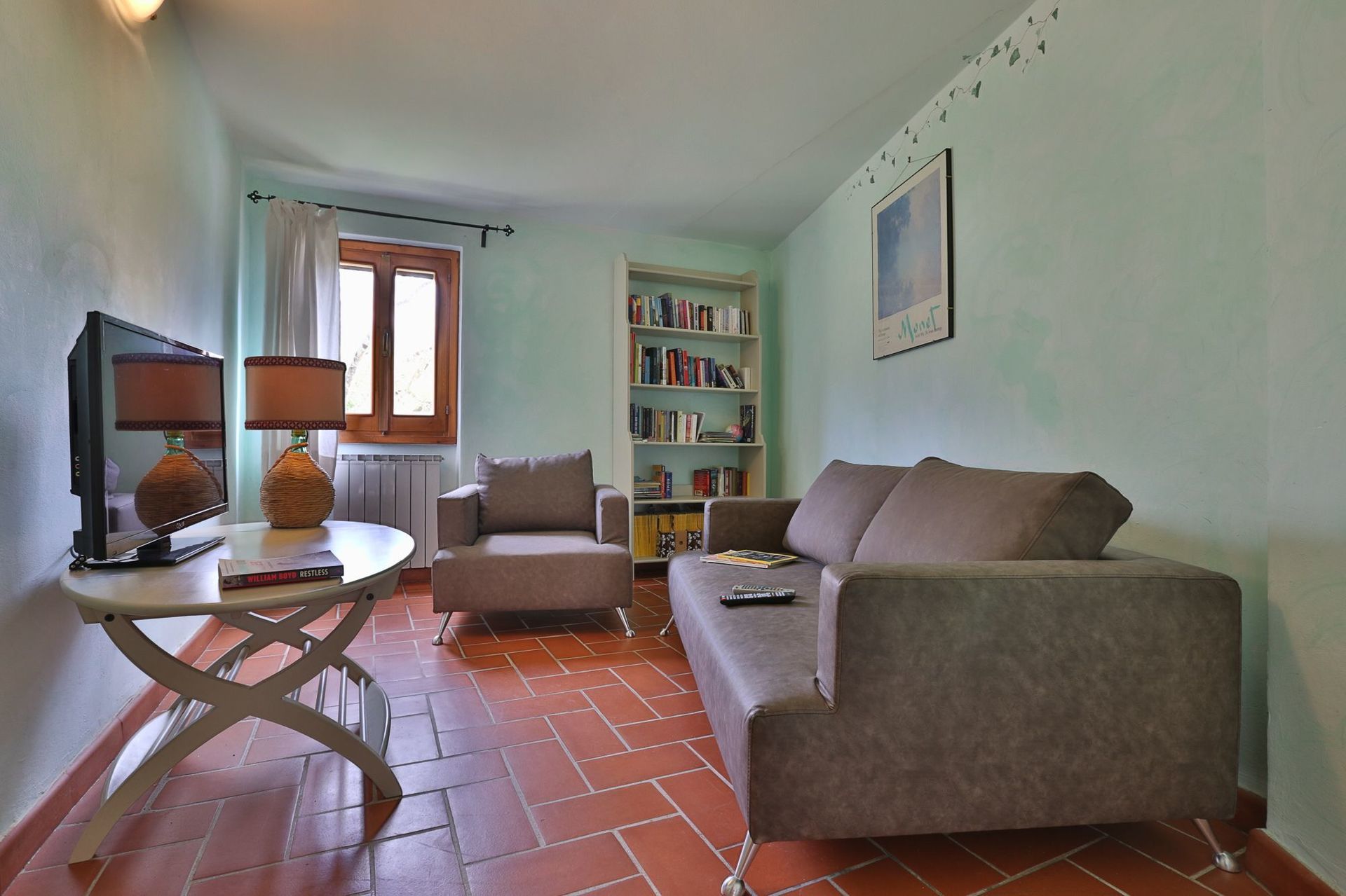 ACQUA (Hochparterre, Zugang über 3 Stufen, und 1° Stock): bietet sechs Personen Platz: die Wohnung hat drei Schlafzimmer und drei Bäder, einen großen Essbereich und eine ausgestattete Küche, ein Wohnzimmer mit Sofas und Stühlhen und einem Bücherregal. Zudem gibt es einen hübschen Balkon mit Gartenmöbeln zum Essen im Freien, wo man bei einem gutem Glas Wein die friedliche Stimmung der Landschaft genießen kann.