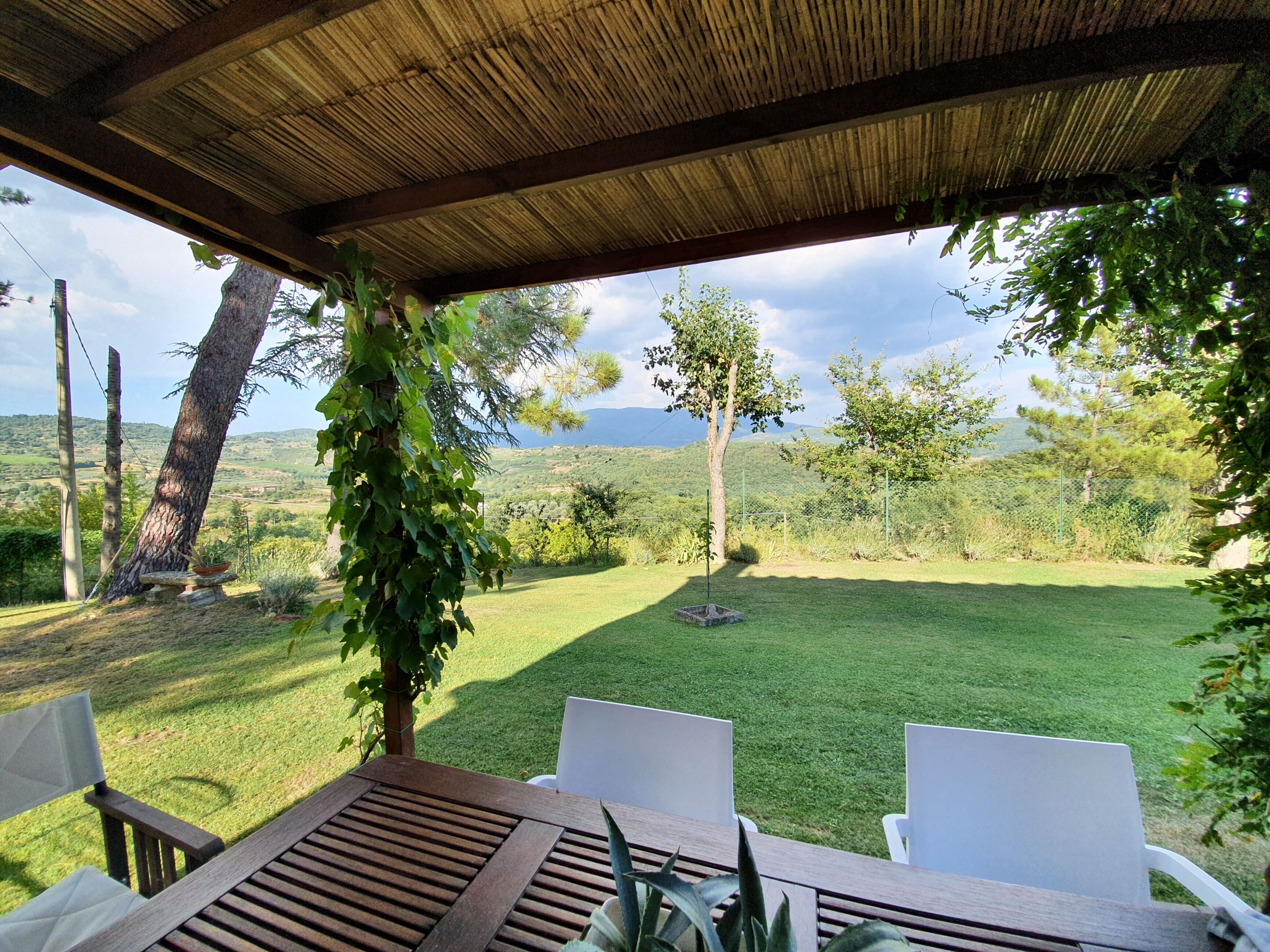 Außenräume, Pergola und Pool. Rund um das Haus finden wir einen großen, komplett eingezäunten Garten (ca. 1.500 qm) und teilweise von hohen Bäumen beschattet. Im Garten befindet sich ein Panorama-Pool (Größe 4 x 8 m, Tiefe 1,50 m) und eine Pergola mit Tisch und Stühlen für Mahlzeiten im Freien, reserviert für die ausschließliche Verwendung von Gästen.