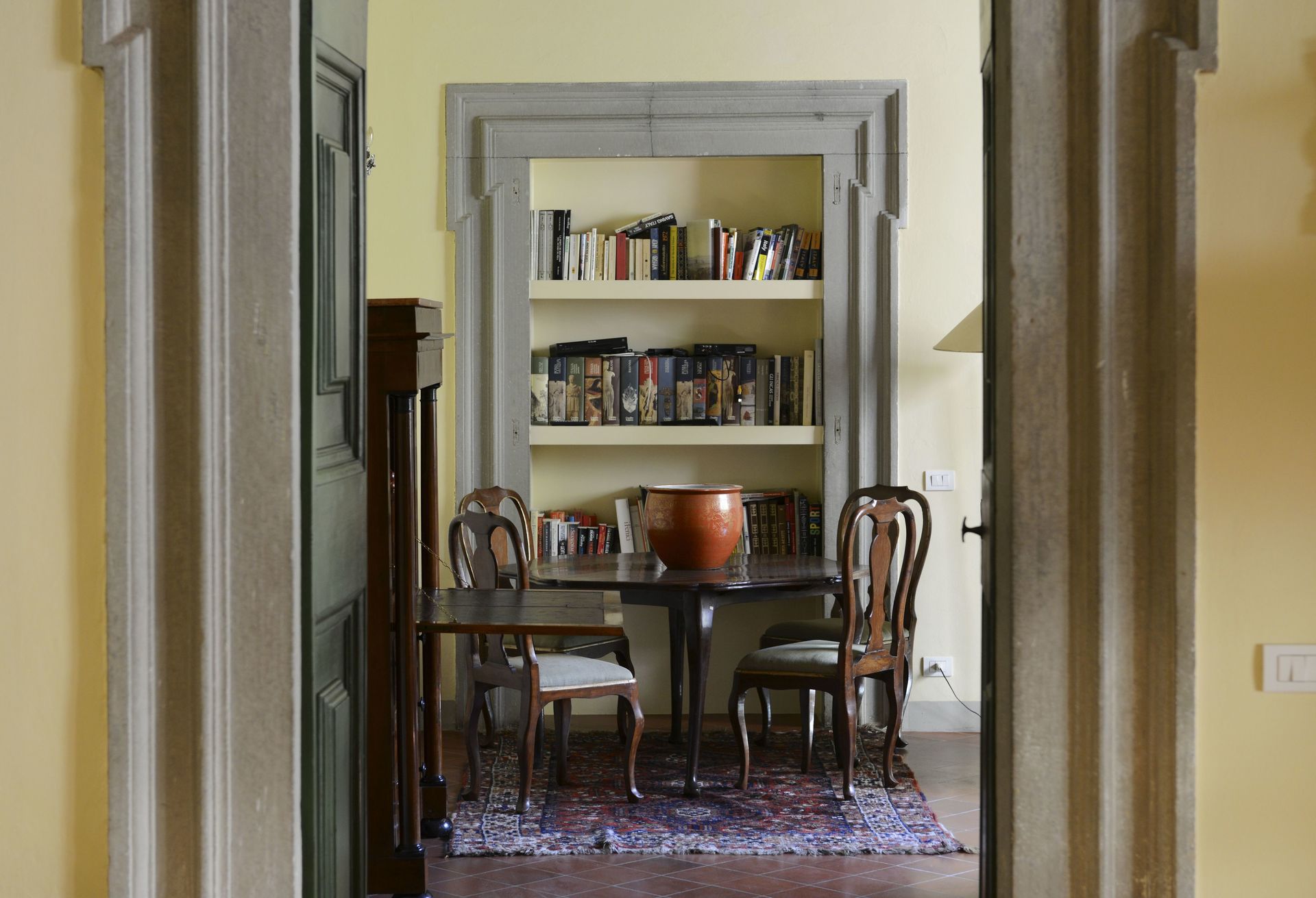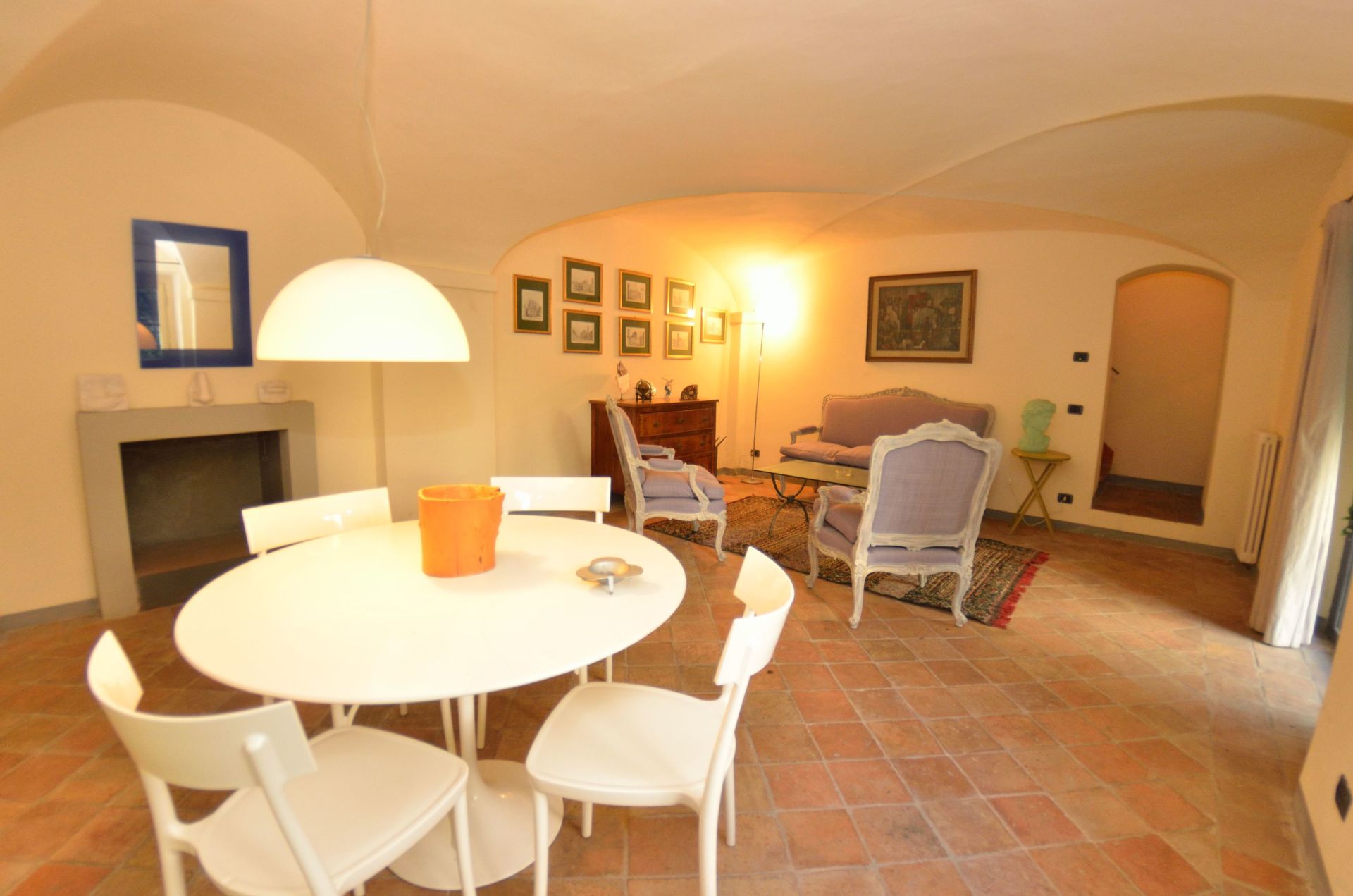 Esszimmer: Esstisch, Sessel, Kamin, Ausgang auf den Garten.