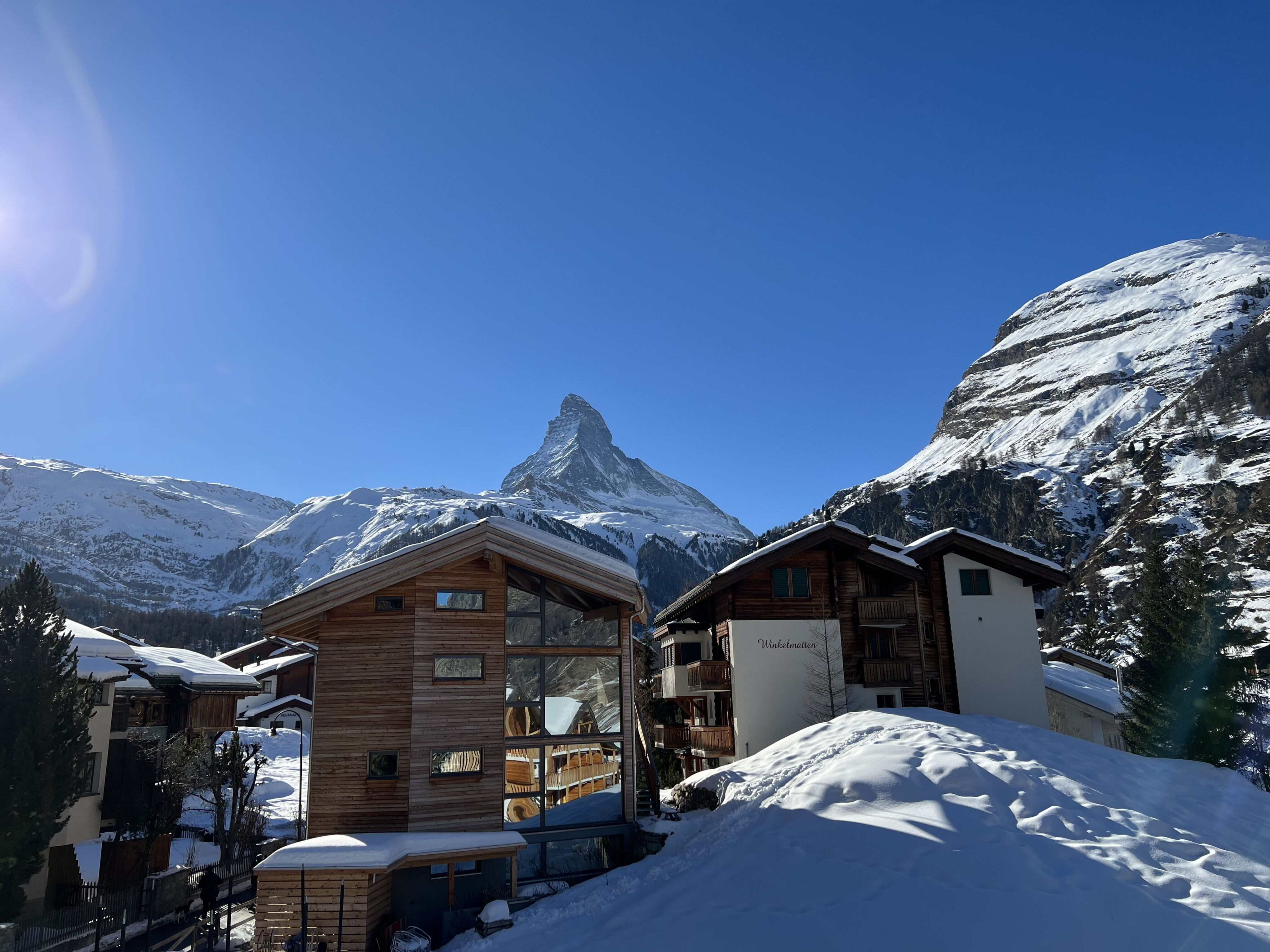 Die Ferienwohnung umfasst 114 m² auf 2 Ebenen, befindet sich im 3. Obergeschoss und bietet Platz für bis zu 7 Gäste in 4 Schlafzimmern und 2 Bädern. Das Erdgeschoss präsentiert sich mit einem großzügigen Wohnzimmer, das einen Kamin mit offenem Herd, einen Esstisch und Zugang zu einem südorientierten Balkon enthält, sowie einer großen Küche. Auf dieser Ebene befinden sich zudem ein Bad mit Dusche und WC sowie ein separates WC. Das erste Obergeschoss ist durch Dachschrägen charakterisiert und beherbergt alle 4 Schlafzimmer. Das erste Schlafzimmer verfügt über ein Doppelbett mit den Maßen 160 cm × 200 cm, ein eigenes Bad und WC. Das zweite Schlafzimmer enthält 2 Einzelbetten à 90 cm × 200 cm. Das dritte Schlafzimmer bietet 1 Einzelbett mit den Maßen 90 cm × 200 cm und Zugang zu einem nordorientierten Balkon. Das vierte Schlafzimmer ist mit 2 Einzelbetten derselben Abmessungen ausgestattet, verfügt über ein Handwaschbecken und hat direkten Zugang zu einem weiteren Balkon. Die gesamte Ferienwohnung ist mit elegantem Parkettboden ausgelegt. Vom ersten Obergeschoss bietet sich ein freier Blick auf das Matterhorn.