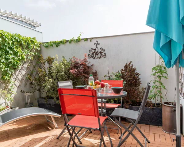 Die Ferienwohnung umfasst 80 Quadratmeter, verteilt auf einen Geschoss, und bietet Platz für maximal 4 Gäste in 2 Schlafzimmern und 2 Badezimmern. Die Wohnung befindet sich im 4. Obergeschoss. Das großzügige Wohn- und Esszimmer mit offener Küche ist das Zentrum der Unterkunft und öffnet sich zu einem nach Westen ausgerichteten Balkon von 4 Quadratmetern mit Balkonmöbeln. Das erste Schlafzimmer ist mit einem Französischen Bett von 160 cm Breite und 200 cm Länge ausgestattet. Das zweite Schlafzimmer verfügt über ein Doppelschlafsofa von 140 cm Breite und 200 cm Länge und bietet direkten Zugang zu einer nach Süden ausgerichteten Terrasse von 10 Quadratmetern. Die Wohnung verfügt über ein Badezimmer sowie ein separates WC. Die offene Küche ist in den Wohnbereich integriert und ist mit einem Ofen, 3 Induktionskochfeldern, einem Toaster, einem Gefrierschrank und einer elektrischen Kaffeemaschine ausgestattet.