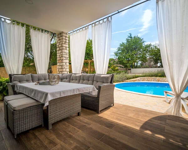 Das Ferienhaus „Ofelia" ist eine moderne, elegant gestaltete Einzelvilla im ruhigen Weiler Buroli, etwa 10 km vom Zentrum von Umag in Kroatien entfernt. Das 2018 erbaute Anwesen verbindet zeitgenössische Architektur mit einer ruhigen natürlichen Umgebung im Herzen Istriens. Die Villa steht auf einem vollständig eingezäunten Privatgrundstück von 900 m² mit einem großzügigen Garten, der einen gepflegten Rasen und einen charmanten Wildgarten umfasst. Das Ferienhaus bietet einen idealen Rückzugsort für einen entspannten Aufenthalt.
