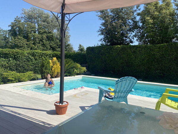 Garten: Schwimmbad (Breite: 3m, Länge: 6m, Tiefe: 1.4m), Grill, Außenbereich für das Essen im Freien, Esstisch (Personen: 6), Pavillon, Gartenmöbel, zwei Sonnenliegen, umzäuntes Grundstück.