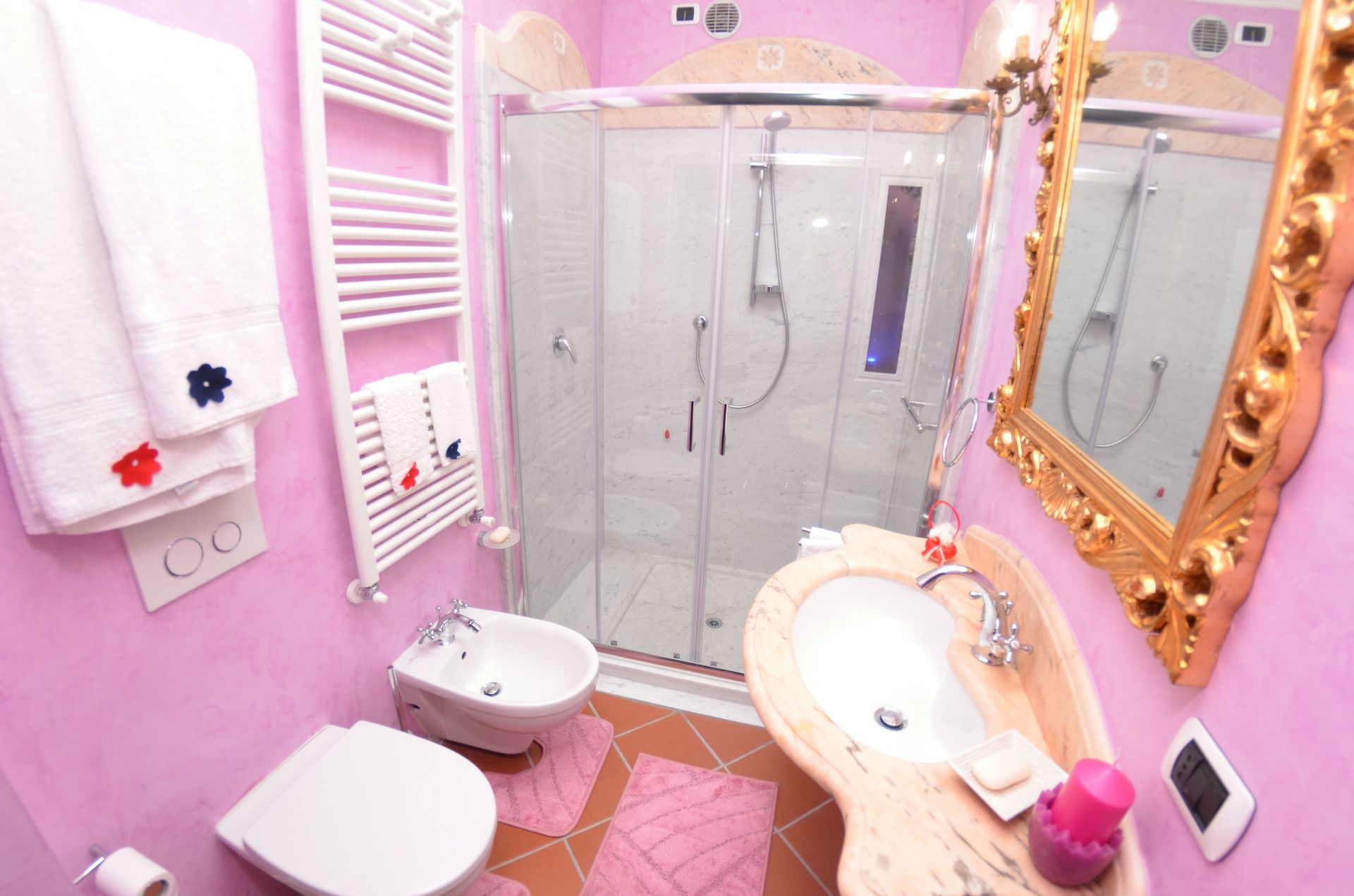 Badezimmer: Waschbecken, WC, Bidet, Dusche.