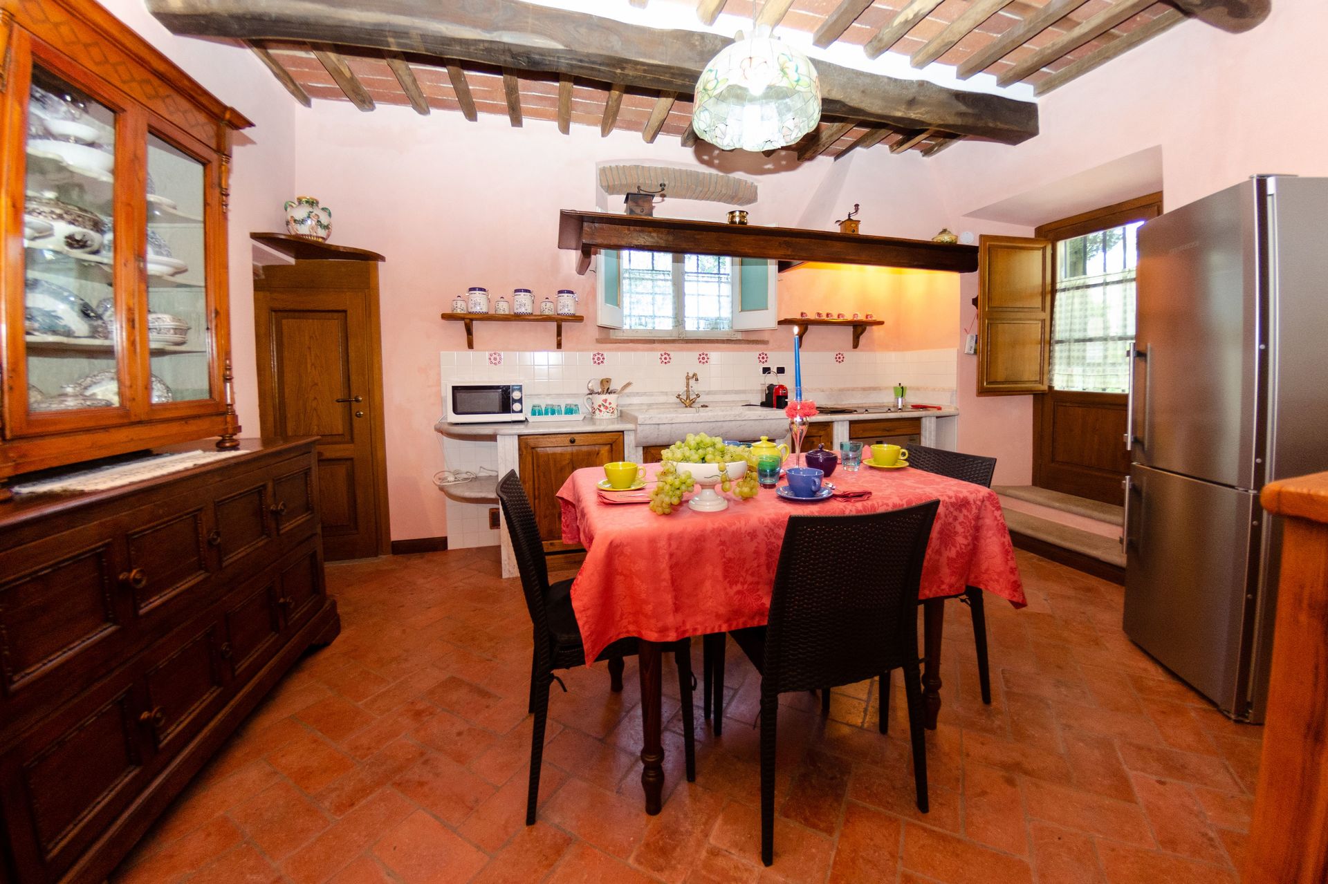 Nach Ankunft werden Sie eine hübsche, saubere und gut gepflegte Unterkunft finden, ideal für einen friedlichen Toskana-Urlaub. Nach einem beschäftigten Tag, den Sie mit Museumsbesuchen verbracht haben, können Sie mit Familie und Freunden am Pool ein schönes, kühles Glas Wein genießen - einfach perfekt, um den Tag ganz ausgeruht ausklingen zu lassen. Zu Ihrem Vergnügen gibt es auf dem Gelände einen Spielplatz and einen Grill. Es gibt eine Küche mit Kaffeemaschine, Mikrowelle, Toaster, Herd und Kühlschrank, sowie ausreichend Geschirr und Besteck für bis zu zehn Personen. Wenn Sie lieber 'al Fresco' speisen, dann können Sie das auf der Garten tun, wo Sie gleichzeitig das schöne Wetter beim Essen genießen können.