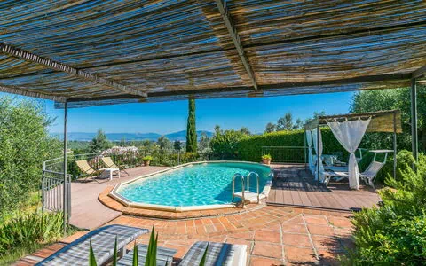 Die Außenbereiche erstrecken sich über 6 Hektar eingezäuntes Gelände mit alten Bäumen, natürlichen Gartenbereichen und offenen Wiesen, die eine harmonische Mischung aus kultivierter und wilder toskanischer Landschaft bilden. Der private Swimmingpool misst 9 x 4 Meter und hat eine Tiefe von 140 cm; er ist vom 2. Mai bis 26. September verfügbar. Eine Außendusche befindet sich in unmittelbarer Nähe des Pools. Eine Terrasse dient als idealer Ort für Mahlzeiten im Freien und gesellige Zusammenkünfte; eine Tischtennisplatte steht den Gästen zur Verfügung.