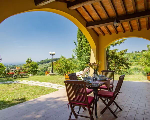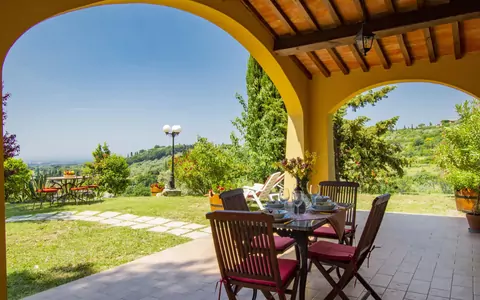 Die Außenbereiche des Ferienhauses sind großzügig gestaltet. Eine Terrasse bietet Ausblick auf die Toskana; die Gartenmöbel laden zum Entspannen ein. Ein Grill steht zur Verfügung. Die ausgedehnte Wiese und der Wildgarten, die Teil des 1.000 m² großen eingezäunten Grundstücks sind, laden zu Spaziergängen ein; die umgebenden Bäume spenden Schatten in den wärmeren Monaten.