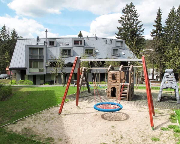 Der gemeinsame Außenbereich der Residenz erstreckt sich über 200 Quadratmeter und ist durchdacht ausgestattet. Ein eigener Kinderspielplatz mit Rutsche und Schaukel bietet einen sicheren und unterhaltsamen Raum für jüngere Gäste. Der Waldrand liegt nur 50 Meter vom Anwesen entfernt und lädt zu ruhigen Spaziergängen in die umgebende Waldlandschaft ein.