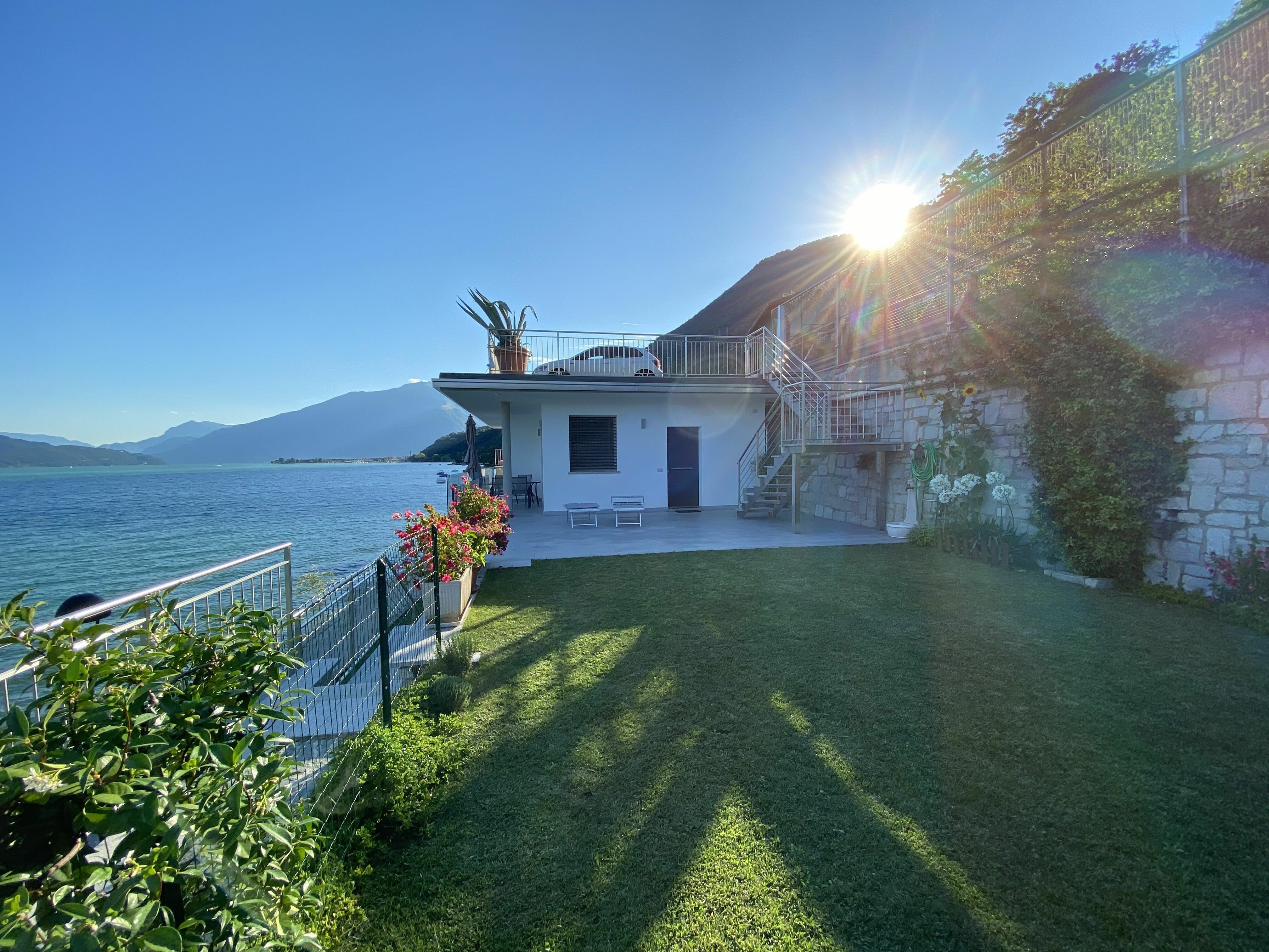 Das Ferienhaus „Gelsomino" ist eine moderne Einzelfamilien-Ferienunterkunft im Ortsteil Cinque Case in Aurogna, Italien. Das 2018 erbaute Haus liegt etwa 1 km vom Zentrum von Gera Lario entfernt und befindet sich auf einem vollständig eingezäunten Privatgrundstück von 210 Quadratmetern mit gepflegtem Rasen. Die besondere Lage des Hauses zeichnet sich durch die unmittelbare Nähe zum See aus — nur 5 Meter entfernt — mit direktem Zugang zum Kiesstrand und zur natürlichen Schönheit der umgebenden Landschaft. Das Anwesen liegt am Rande des Ortsgebiets; zu beachten ist, dass sich eine Hauptstraße 30 Meter vom Haus entfernt befindet.
