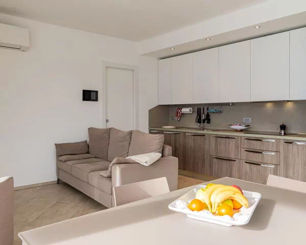 Die Ferienwohnung Gelsomino (GLA125) umfasst 65 m² auf einer Ebene und bietet Platz für bis zu 4 Gäste in 2 Schlafzimmern und 1 Bad. Das Wohn- und Esszimmer bildet den zentralen Bereich und ist mit einem Esstisch ausgestattet; von hier aus besteht direkter Zugang zur teilweise überdachten Terrasse. Das erste Schlafzimmer verfügt über ein Französisches Bett von 160 cm und öffnet sich zu einem privaten Balkon, während das zweite Schlafzimmer 2 Betten enthält und ebenfalls über einen eigenen Balkonzugang verfügt. Das Bad ist mit einer Dusche und WC ausgestattet. Die Küche ist offen in den Wohnbereich integriert und verfügt über alle notwendigen Geräte. Die Terrasse bietet Ausblicke auf den See, die Berge und den Monte Legnone (2609 m).