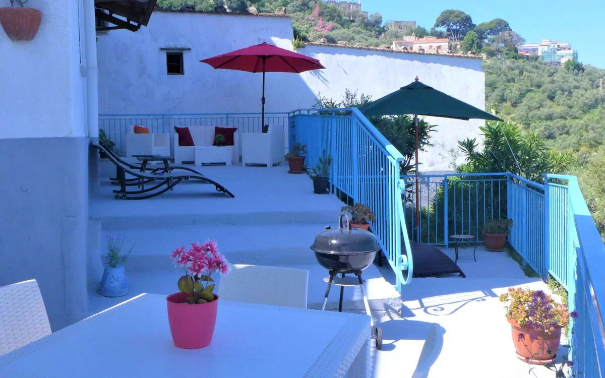 Massa Lubrense 7 km von Sorrento: Gemütliches Zweifamilienhaus "Blue Paradise - Sea View Apartment", umgeben von Bäumen und Wiesen. 1 km vom Zentrum von Massa Lubrense, ruhige, sonnige, erhöhte Lage, 2 km vom Meer, 2 km vom Strand, im Grünen. Zur Alleinbenutzung: Terrasse (50 m2), Gartenmöbel, Grill. Im Hause: Wireless LAN. 100 m Fussweg (100 Stufen) bis zum Haus. Öffentliche Parkplätze 100 m auf der Strasse. Einkaufsgeschäft 200 m, Lebensmittelgeschäft 500 m, Supermarkt 1 km, Restaurant, Bar 500 m, Bäckerei 1 km, Internet-Café 1 km, Bushaltestelle "Massa Lubrense" 1 km, Bahnstation "Sorrento" 9 km, Fähre "Sorrento to Capri/Ischia/Napoli" 9 km, Sandstrand "Marina di Puolo" 5 km, Kieselstrand 2 km, Felsstrand "Bagni della Regina Giovanna" 6 km, Tauchzentrum 2 km, Hallenbad 9 km, betonierter Strand 2 km, FKK - Strand 6 km. Tennis 2 km, Reitstall 10 km, Wanderwege ab Haus 10 m. Nahe gelegene Sehenswürdigkeiten: Sorrento 9 km, Positano 20 km, Amalfi 35 km, Napoli 50 km, Pompei 35 km, Marina del Cantone 11 km. Bitte beachten: kein Fahrstuhl vorhanden. Taxi kann nicht bis zum Haus fahren.