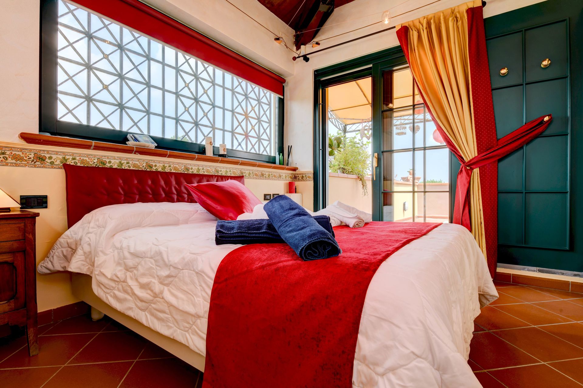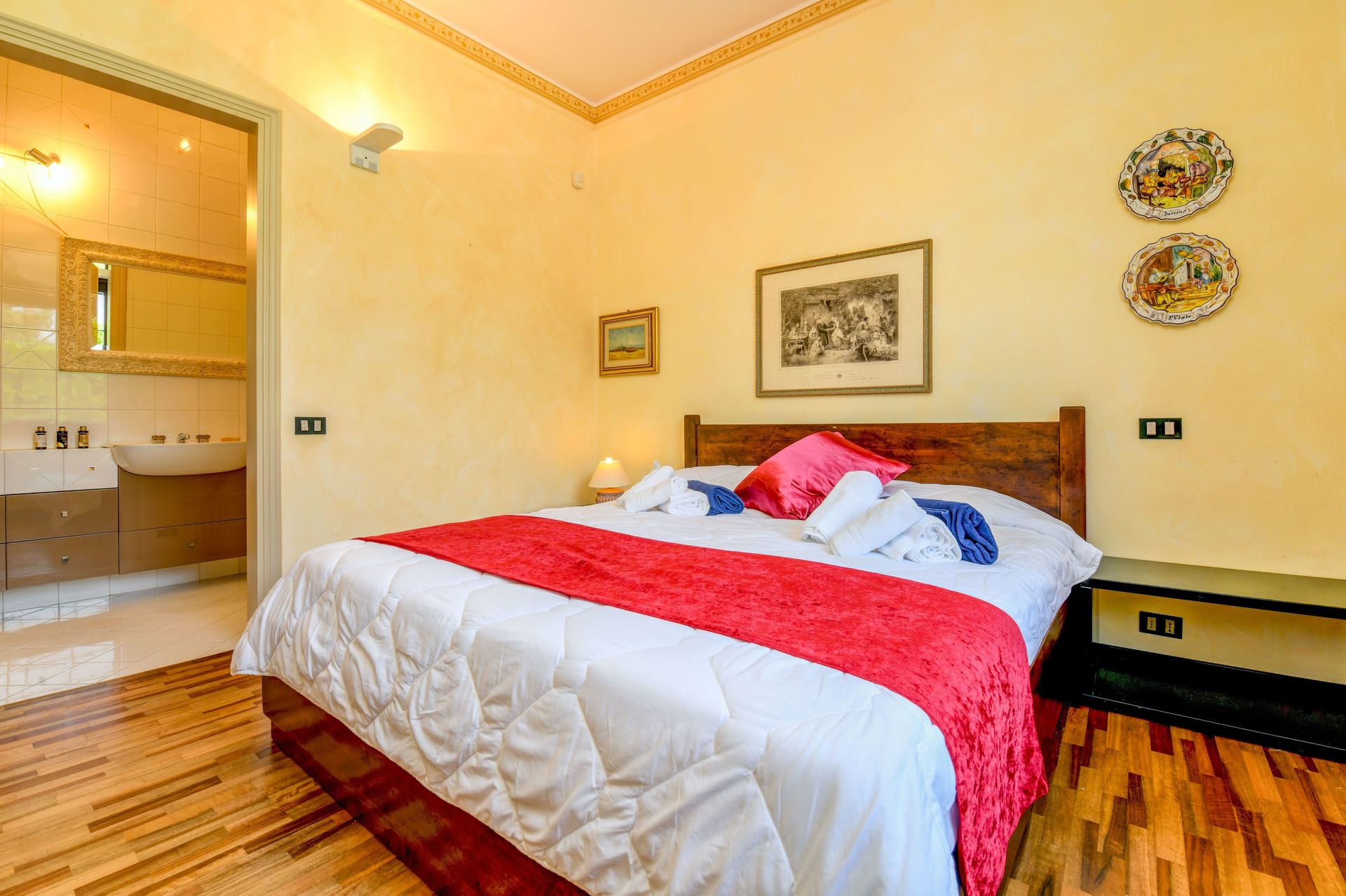 Schlafzimmer mit Bad: französisches Bett, Klimaanlage, Waschbecken, WC, Bidet, Dusche, Ausgang auf die Terrasse.