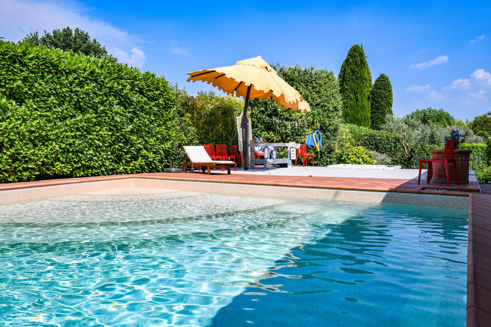 Garten: Schwimmbad, Heißwasser-Whirlpool im Freien, Grill, Außenbereich für das Essen im Freien, Gartenmöbel.