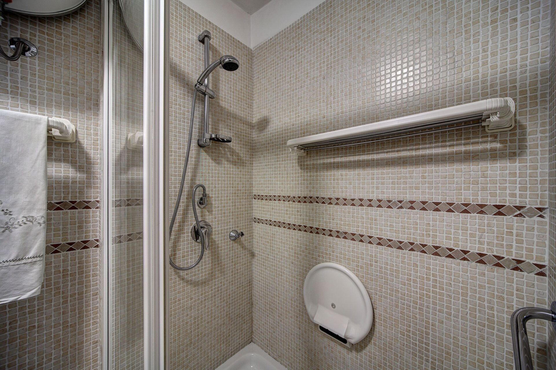 Badezimmer: Waschbecken, WC, Bidet, Dusche, Fön.