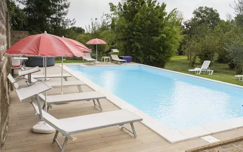Das Grundstück erstreckt sich über 18.000 Quadratmeter und umfasst einen terrassierten Garten mit alten Bäumen sowie offene Wiesenbereiche, die sich für Spaziergänge und zum Entspannen in der Natur eignen. Der Swimmingpool misst 11 x 5 Meter bei einer Tiefe von 150 cm und ist vom 23. Mai bis 3. Oktober verfügbar; er wird durch ein Salzelectrolyse-Reinigungssystem gepflegt. Eine Außendusche befindet sich in der Nähe des Poolbereichs. Eine Tischtennisplatte steht den Gästen zur Verfügung. Der Zugang zum Grundstück erfolgt über eine 250 Meter lange unbefestigte Straße; ein Parkplatz befindet sich direkt am Haus.