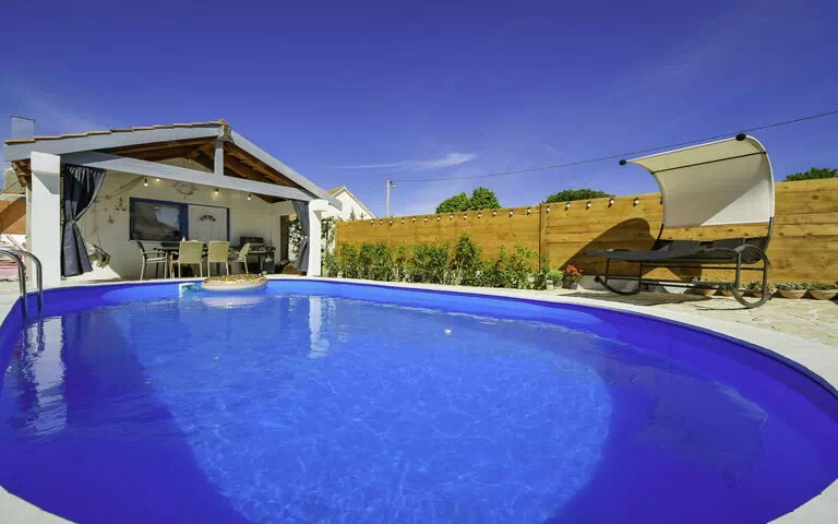 Tinj 8 km von Biograd na Moru: Doppelhaus "Kristina". 8 km vom Zentrum von Biograd, sonnige, erhöhte Lage, 8 km vom Meer. Zur Alleinbenutzung: Grundstück 120 m2 (eingezäunt), Schwimmbad (8 x 4 m, 32 m2, 145 cm tief, 01.05.-01.10.) mit Innentreppe. Ungleichmässige Schwimmbadform, Terrasse (20 m2), Gartenmöbel. Im Hause: Internetzugang, Waschmaschine. Parkplatz (für 2 Autos) beim Haus auf dem Grundstück. Einkaufsgeschäft 300 m, Restaurant 8 km, Kieselstrand 8 km. Tennis 8 km. Nahe gelegene Sehenswürdigkeiten: Amusement park 8 km. Bitte beachten: Flugplatz 19 km vom Haus.