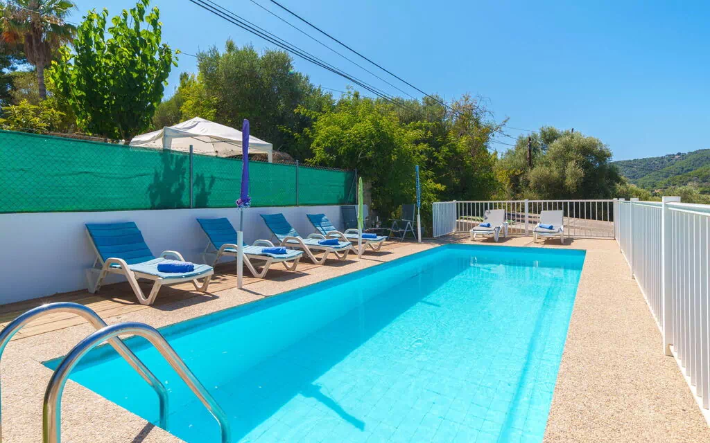 "Es Muntant", 6-Zimmer-Haus 200 m2 auf 2 Stockwerken. Objekt geeignet für 8 Erwachsene. Geräumig und hell, rustikal und gemütlich eingerichtet: offenes grosses Wohn-/Esszimmer mit Sat-TV, Digital-TV, Internationale TV-Sender, Klimaanlage und Warmluftheizung. Ausgang zum Gartensitzplatz. 1 Doppelzimmer mit 1 Doppelbett (160 cm, Länge 200 cm). Grosse Küche (4 Kochplatten, Backofen, Geschirrspüler, Mikrowelle, Tiefkühler) mit Esstisch. Ausgang zum Gartensitzplatz, zum Schwimmbad. Bad/Bidet/WC, Dusche/WC, Doppelwaschbecken. Obergeschoss: 1 Doppelzimmer mit 1 franz. Bett (150 cm, Länge 190 cm). 1 Doppelzimmer mit 1 Doppelbett (160 cm, Länge 200 cm). 1 Doppelzimmer mit 1 franz. Bett (150 cm, Länge 190 cm). Garten, Rasen, Laube. Terrassenmöbel, Balkonmöbel, Gartengrill, Liegestühle, Loggia. Schöne Sicht auf die Berge, das Schwimmbad, den Garten, die Landschaft und den Wald. Zur Verfügung: Waschmaschine, Bügeleisen, Kinderhochstuhl, Babybett bis 2 Jahre, Haartrockner. Internet (WLAN, gratis). Parkplatz (eingezäunt). ETV/6267 // Reg. Nr.: ESFCTU00000702400071679500000000000000000000ETV/62671