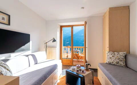 3-Zimmer-Wohnung 60 m2, im erhöhten Erdgeschoss. Komfortabel und schön eingerichtet: Wohn-/Esszimmer mit 1 Doppeldiwanbett (160 cm, Länge 190 cm), TV (Flachbildschirm). Ausgang zum Balkon, Richtung Osten. 1 Zimmer mit 1 franz. Bett (160 cm, Länge 190 cm). 1 Zimmer mit 2 Betten (80 cm, Länge 190 cm). Offene Küche (Backofen, Geschirrspüler, 4 Glaskeramikplatten, Toaster, Wasserkocher, Mikrowelle, Tiefkühler, elektrische Kaffeemaschine, Racletteofen, Fondue Set (Käse)). Dusche, sep. WC. E-Heizung. Balkon, Ostlage. Sehr schöne Panoramasicht auf die Berge und die Landschaft. Zur Verfügung: Waschmaschine, Babybett bis 2 Jahre, Haartrockner. Internet (WLAN, gratis). Parkplatz (2 Autos). Bitte beachten: Nichtraucher-Unterkunft. Rauchmelder, Feuerlöscher.