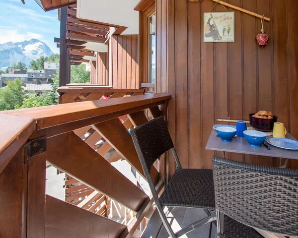 Die Ferienwohnung umfasst 30 Quadratmeter auf zwei Ebenen und bietet Platz für bis zu 4 Gäste mit 1 Schlafzimmer und 1 Bad. Im dritten Obergeschoss befinden sich der Wohn- und Essbereich sowie die Kitchenette mit 4 Kochfeldern. Das Schlafzimmer ist mit einem Französischen Bett von 140 cm Breite und 190 cm Länge ausgestattet. Eine Schlafnische in offener Bauweise enthält ein Etagenbettensystem mit zwei Betten à 90 cm Breite und 190 cm Länge. Das Bad verfügt über eine Dusche; ein separates WC ist vorhanden. Ein nach Süden und Osten ausgerichteter Balkon erweitert den Wohnbereich nach außen und bietet Ausblicke auf die Berge und die umliegende Ferienanlage.