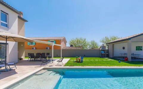 Šišan 4 km von Medulin: Modernes, schönes Doppelhaus "Villa Edi", auf 2 Stockwerken, Baujahr 2021. 300 m vom Zentrum von Šišan, 2 km vom Zentrum von Ližnjan, 7 km vom Zentrum von Pula, 3 km vom Meer, 3 km vom Strand. Zur Alleinbenutzung: Grundstück 700 m2 (eingezäunt) mit Rasen 200 m2, Schwimmbad eckig (45 m2, 135 cm tief, saisonale Verfügbarkeit: 03.Apr. - 06.Nov.) mit Innentreppe und Salzelektrolyse-Reinigungssystem. Aussendusche, Tischtennis, Badminton, Grill, Grillhaus, Poolpflege durch den Besitzer/Gärtner. Im Hause: Internetzugang, Zentralheizung, Klimaanlage, Alarmanlage, Waschmaschine, Wäschetrockner. Parkplatz (für 2 Autos) beim Haus auf dem Grundstück. E-Ladestation. Einkaufsgeschäft 300 m, Supermarkt 4 km, Restaurant 50 m, Café 300 m, Bushaltestelle 20 m, Kieselstrand 3 km, Steinstrand 3 km, Felsstrand 3 km. Jacht-Hafen 4 km, Surfschule 4 km, Segelschule 4 km, Tennis 2 km, Kinderspielplatz 800 m. Jugendgruppen nur auf Anfrage. Bitte beachten: Flugplatz 10 km vom Haus. Schwimmbad mit Hydromassage.