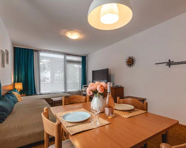 Die Ferienwohnung "Alpenpanorama" umfasst 60 Quadratmeter, verteilt auf das erste Obergeschoss, und bietet Platz für maximal 4 Gäste in 1 Schlafbereich und 1 Bad. Die Einheit wird durch eine Eingangshalle erschlossen, von der aus die Wohnräume zugänglich sind. Das Wohn- und Schlafzimmer ist mit einem Doppelschlafsofa ausgestattet und verfügt über direkten Zugang zu einem der beiden Balkone. Das separate Wohn- und Esszimmer enthält 2 Einzelbetten à 90 cm Breite und 200 cm Länge, einen Esstisch und Zugang zum zweiten Balkon. Die Küche ist kompakt gestaltet und verfügt über 4 Kochfelder, einen Ofen, eine Geschirrspülmaschine und eine elektrische Kaffeemaschine. Das Bad ist mit einer Badewanne und WC ausgestattet. Die gesamte Ferienwohnung ist mit Teppichboden ausgelegt.