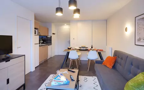 Residenz "Le Hameau", 1'650 m.ü.M.. 81 Wohnungen in der Residenz. Im Ortszentrum von Les 2 Alpes, 62 km vom Zentrum von Briancon, 67 km vom Zentrum von Grenoble, zentrale Lage, 50 m vom Skigebiet. Zur Mitbenutzung: Hallenbad beheizt (8 x 4 m, 145 cm tief). Dusche/WC im Poolbereich, Terrasse. In der Anlage: Empfang, Aufenthaltsraum, Sauna, Fitnessraum, Sprudelbad, Hamam, Billard, Skiraum, Waschmaschine, Wäschetrockner (zur Mitbenutzung, extra). Frühstück (extra). Parkplatz/Garage nur für kleine - mittlere Fahrzeuge geeignet. Maße: Höhe 200 cm. Einkaufsgeschäft 50 m, Supermarkt 650 m. Sessellift 50 m, Gondelbahn, Skischule 800 m, Eisfeld 900 m. Bekannte Skigebiete sind gut erreichbar: Télésiège Vallée Blanche 50 m, Télésiège Belle Etoile 450 m, Télécabine Jandri 800 m. Bitte beachten: Das Foto ist nur ein Hausbeispiel. Die Mietobjekte können sich in Wohnfläche, Raumaufteilung, Ausstattung und Einrichtung unterscheiden.
