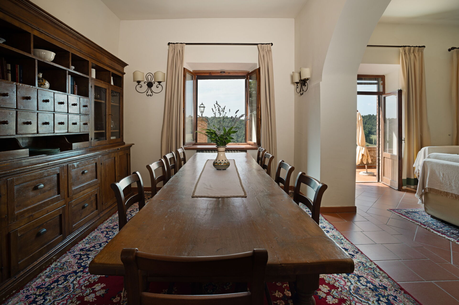 Zweiter Stock: Küche (4 Kochstellen, Kühlschrank, Espressomaschine, Wasserkocher) mit Esstisch, Doppelzimmer mit Ehebett und privatem Bad mit Dusche, Wohnzimmer, Doppelzimmer mit Ehebett, Bad mit Dusche.