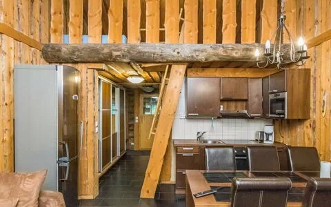Silver log row house, apartment built in 1983. Kitchen living room at the same space, toilet + shower room, sauna, upstairs shallow loft with two floor level beds 140cm and 120cm. Sofa bed in downstairs.