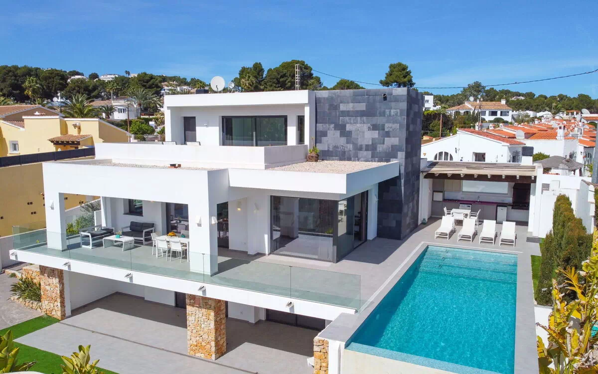 Sehr moderne, schöne, komfortable Villa "La Haya", auf 2 Stockwerken. 800 m vom Zentrum von Moraira, ruhige, sonnige Lage, vom Meer, 900 m vom Strand. Zur Alleinbenutzung: Grundstück 800 m2 (eingezäunt), schöner, gepflegter Garten Rasen und Pflanzen, Schwimmbad eckig (10 x 4 m, 30 - 210 cm tief, saisonale Verfügbarkeit: 01.Jan. - 31.Dez.) mit Innentreppe. Aussendusche, Poolhaus mit Kühlschrank und Kochherd, Gartenmöbel, Grill, Grillhaus, Poolpflege durch den Besitzer/Gärtner. Im Hause: Klimaanlage, Waschmaschine. Parkplatz (für 2 Autos) auf dem Grundstück. Einkaufsgeschäft 800 m, Supermarkt 1.4 km, Restaurant 800 m, Zentrum zu Fuss in 11 Minuten erreichbar, Bushaltestelle "Moraira" 1.9 km, Bahnstation "Teulada" 7.9 km, Fähre "Denia" 34.8 km, Sandstrand "playa L'Ampolla" 900 m. Jacht-Hafen 1.4 km, Tennis 2 km. Bitte beachten: geeignet für Familien. Jugendgruppen nur auf Anfrage.