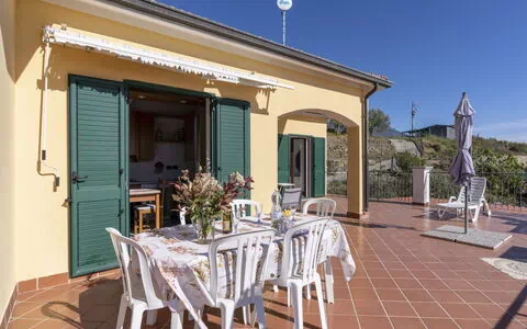 Die Ferienwohnung "Aurora" umfasst 80 m² auf einer Etage und bietet Platz für maximal 6 Gäste in 2 Schlafzimmern und 1 Bad. Das erste Schlafzimmer ist mit einem Doppelbett von 160 cm ausgestattet und verfügt über direkten Zugang zur großen Terrasse. Das zweite Schlafzimmer enthält ebenfalls ein Doppelbett von 160 cm. Der offene Wohn- und Schlafbereich ist mit einem Doppelschlafsofa von 160 cm und einem Esstisch ausgestattet und öffnet sich ebenfalls zur Terrasse. Die offene Küche ist vollständig ausgestattet und bietet direkten Zugang zur Terrasse, ebenso wie der Wohnbereich. Das Bad ist mit einer Dusche, einem Bidet, einer WC und einem Doppelwaschbecken ausgestattet. Eine große Terrasse von 120 m² mit Terrassenmöbeln, 4 Liegestühlen und einem Grill vervollständigt die Unterkunft und bietet einen Panoramablick auf das Meer und das Tal.
