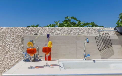 Die Küche verfügt über einen Ofen, eine Geschirrspülmaschine, 4 Induktionskochfelder, einen Toaster, einen Wasserkocher, einen Gefrierschrank und eine elektrische Kaffeemaschine. Eine Klimaanlage ist im Wohnzimmer sowie in beiden Schlafzimmern vorhanden; eine Waschmaschine steht den Gästen zur Verfügung. Im Wohnbereich und in jedem Schlafzimmer befindet sich ein Satelliten-Flachbildfernseher. Auf der Terrasse sind ein Grill, Terrassenmöbel und Liegestühle vorhanden; eine Wi-Fi-Verbindung ist kostenlos verfügbar. Bügeleisen, Haartrockner, Hochstuhl und Babybett sind vorhanden.