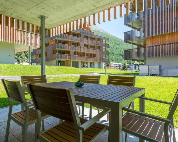 The property offers modern, stylish holiday flats with outdoor seating areas or balconies. These vacation apartments are part of the "Montela Hotel & Resort" complex and are situated in a quiet yet central location in Saas-Grund. Each 4.5-room holiday apartment on the ground floor can accommodate 6-7 people and features three separate bedrooms, each with a double bed. Additionally, there is a sofa bed in the living area that can accommodate an extra person. The apartments are comfortably and lovingly furnished, with an open kitchen fully equipped for your convenience.