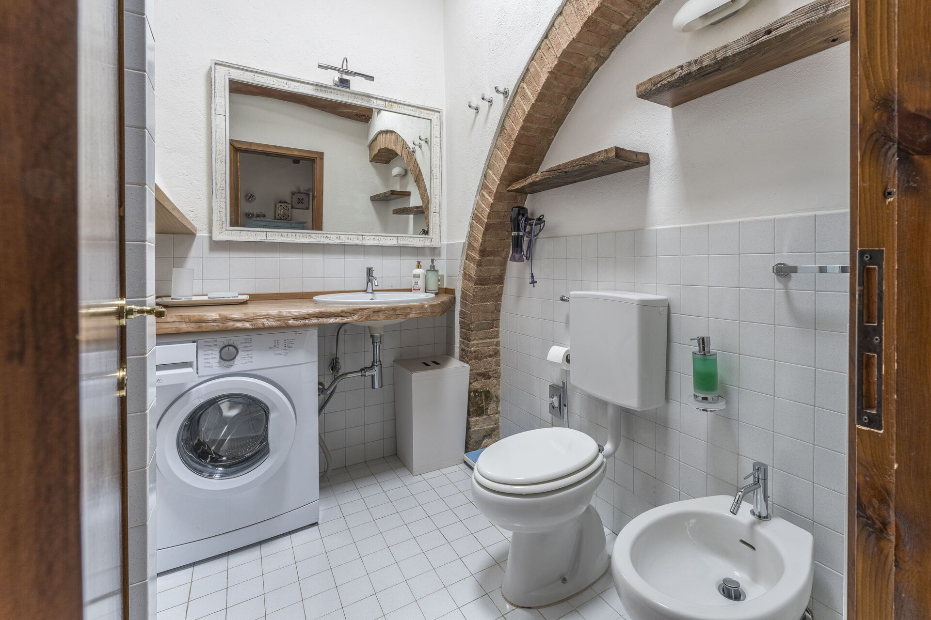 Badezimmer: Waschbecken, WC, Bidet, Dusche, Fön, Waschmaschine, WiFi Internet.