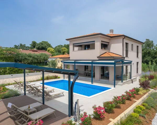 Die Villa Karina liegt im ruhigen Weiler Kadumi, etwa 5,5 km vom Zentrum von Poreč in Kroatien entfernt, und wurde 2022 erbaut. Das zweistöckige Ferienhaus erstreckt sich über ein vollständig eingezäuntes Privatgrundstück von 1.100 m² in sonniger, offener Lage und bietet einen verfeinerten und ruhigen Rückzugsort im Herzen Istriens. Das Anwesen liegt in einer großzügigen Umgebung, die ein Gefühl von Abgeschiedenheit und Raum vermittelt.
