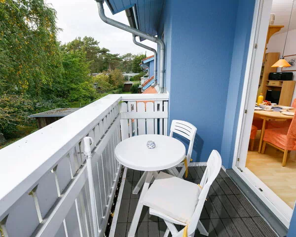 Die Ferienwohnung "Martin" umfasst 40 m² auf einer Etage und bietet Platz für maximal 2 Gäste in 1 Schlafzimmer und 1 Bad. Die Wohnung befindet sich im obersten Geschoss und zeichnet sich durch charakteristische Dachschrägen aus, die dem Raum eine warme Atmosphäre verleihen. Der Wohn- und Essbereich bildet das Zentrum der Wohnung und verfügt über direkten Zugang zu einem privaten Balkon, auf dem Terrassenmöbel zur Verfügung stehen. Das Schlafzimmer ist mit einem Doppelbett ausgestattet. Das Bad ist mit Dusche und WC ausgeführt. Eine Kitchenette ist in den Wohnbereich integriert und verfügt über einen Toaster, einen Wasserkocher und eine elektrische Kaffeemaschine.