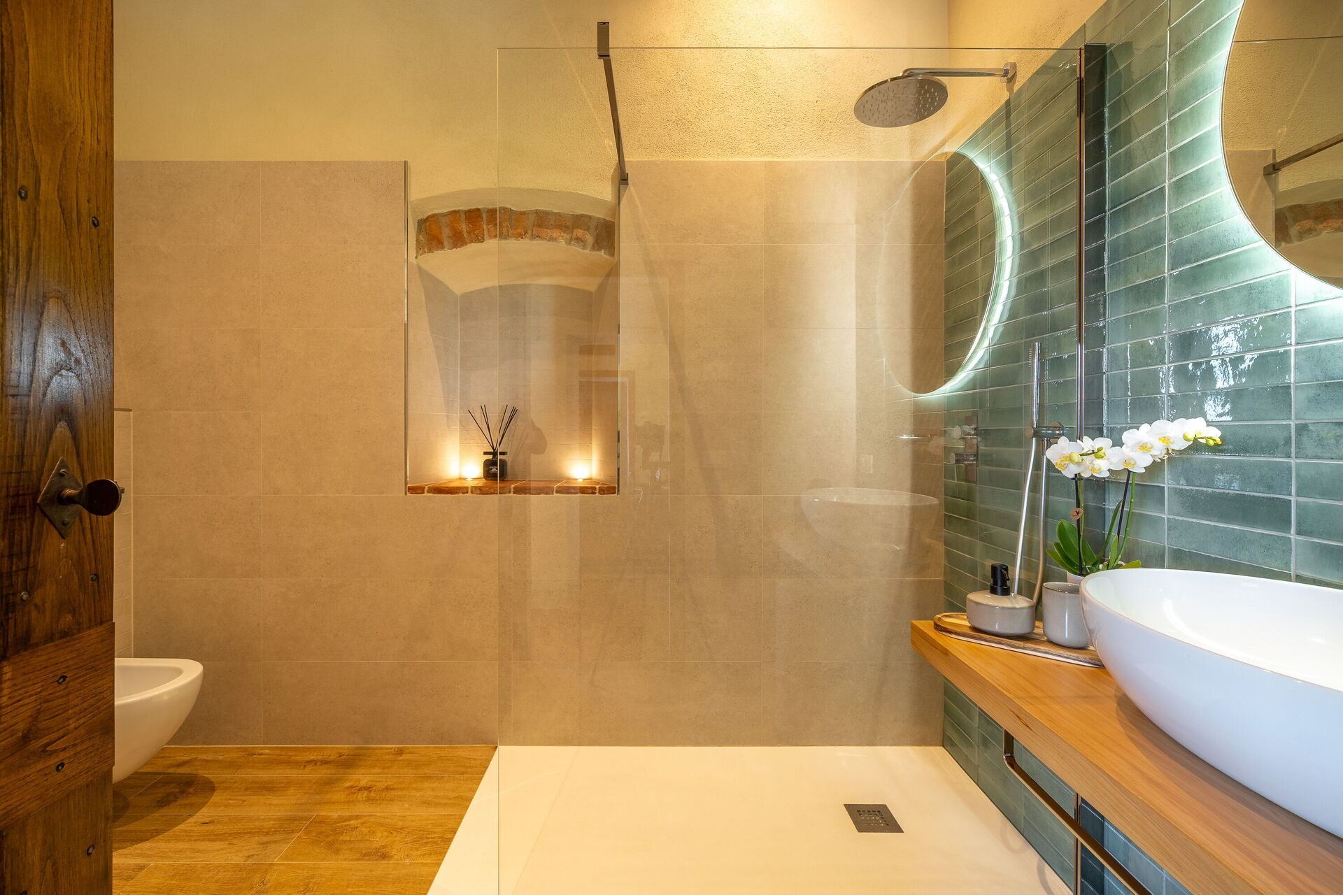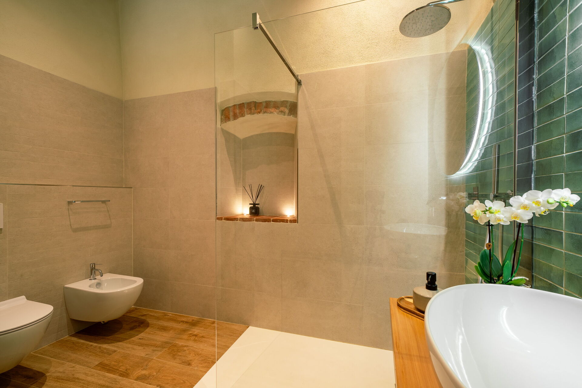 Badezimmer: Waschbecken, WC, Bidet, Dusche, Dusche, Waschmaschine, WiFi Internet.