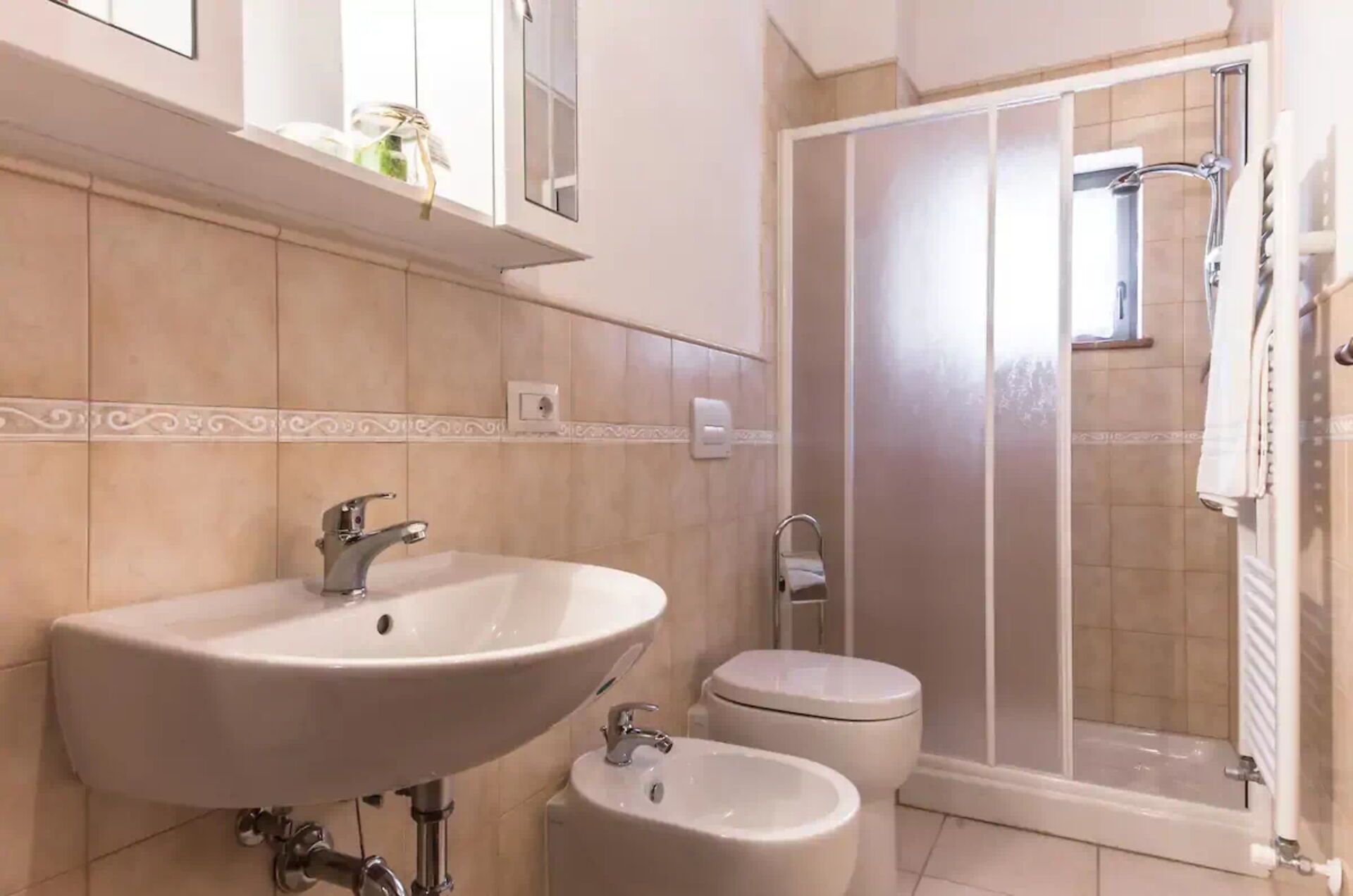 Badezimmer: Waschbecken, WC, Bidet, Dusche, WiFi Internet.