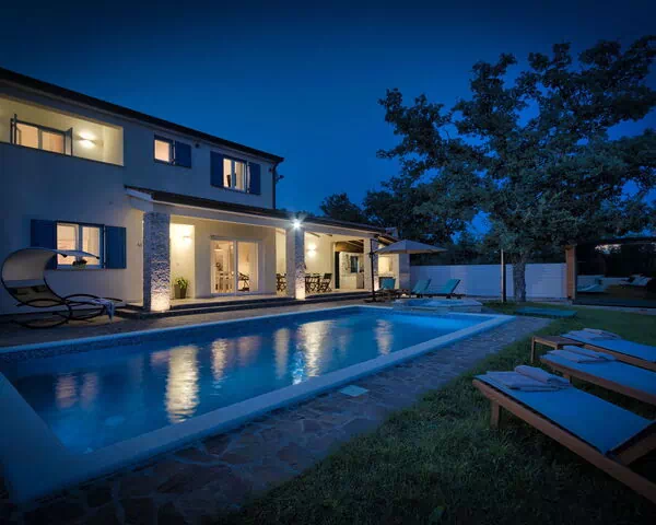 Die Villa "Augusta" ist ein zweistöckiges Ferienhaus im Herzen Istriens in Kroatien, gelegen in der malerischen Umgebung nahe Pazin. Das elegante Anwesen befindet sich auf einem vollständig eingezäunten Privatgrundstück von 1.000 m² und bietet den Gästen ein außergewöhnliches Gefühl von Privatsphäre und Ruhe. Die Villa eignet sich besonders für Familien, die einen verfeinerten und komfortablen Rückzugsort in einer der malerischsten Binnenregionen Kroatiens suchen. Das Anwesen verfügt über eine traditionelle Sauna sowie eine Klimaanlage in allen Bereichen.