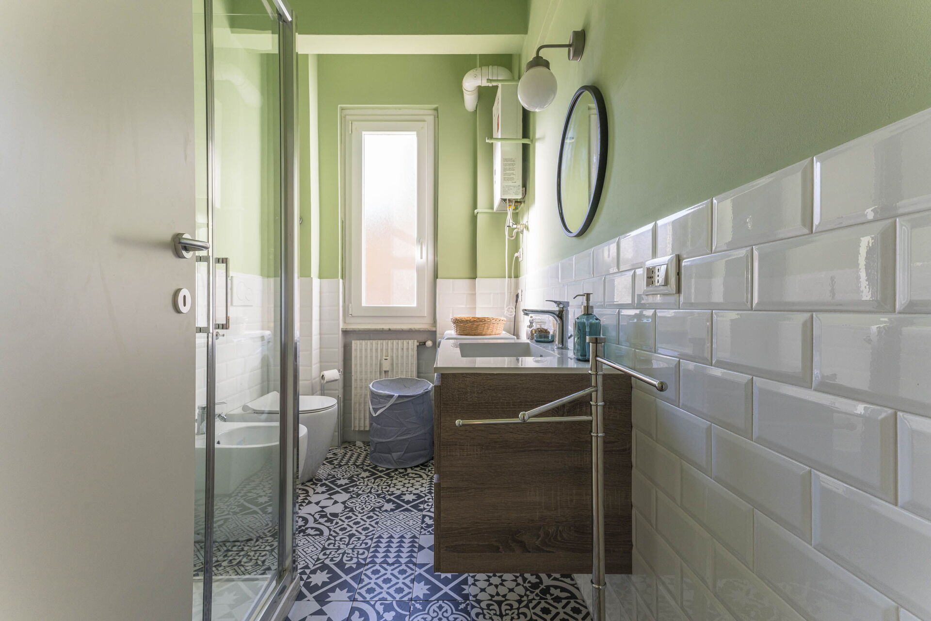 Badezimmer: Waschbecken, WC, Bidet, Dusche, Fön, WiFi Internet.