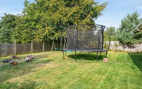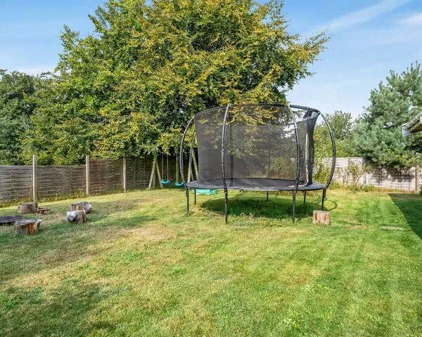 Das Grundstück ist großzügig bemessen und bietet reichlich Platz zur Entspannung und zum Genießen der Natur. Der gepflegte Garten schafft eine ruhige Umgebung mit üppigem Grün. Ein Grillbereich lädt zu Mahlzeiten im Freien ein; für jüngere Gäste steht ein Kinderspielplatz mit Schaukel zur Verfügung. Ein Trampolin bietet zusätzliche Freizeitmöglichkeiten.