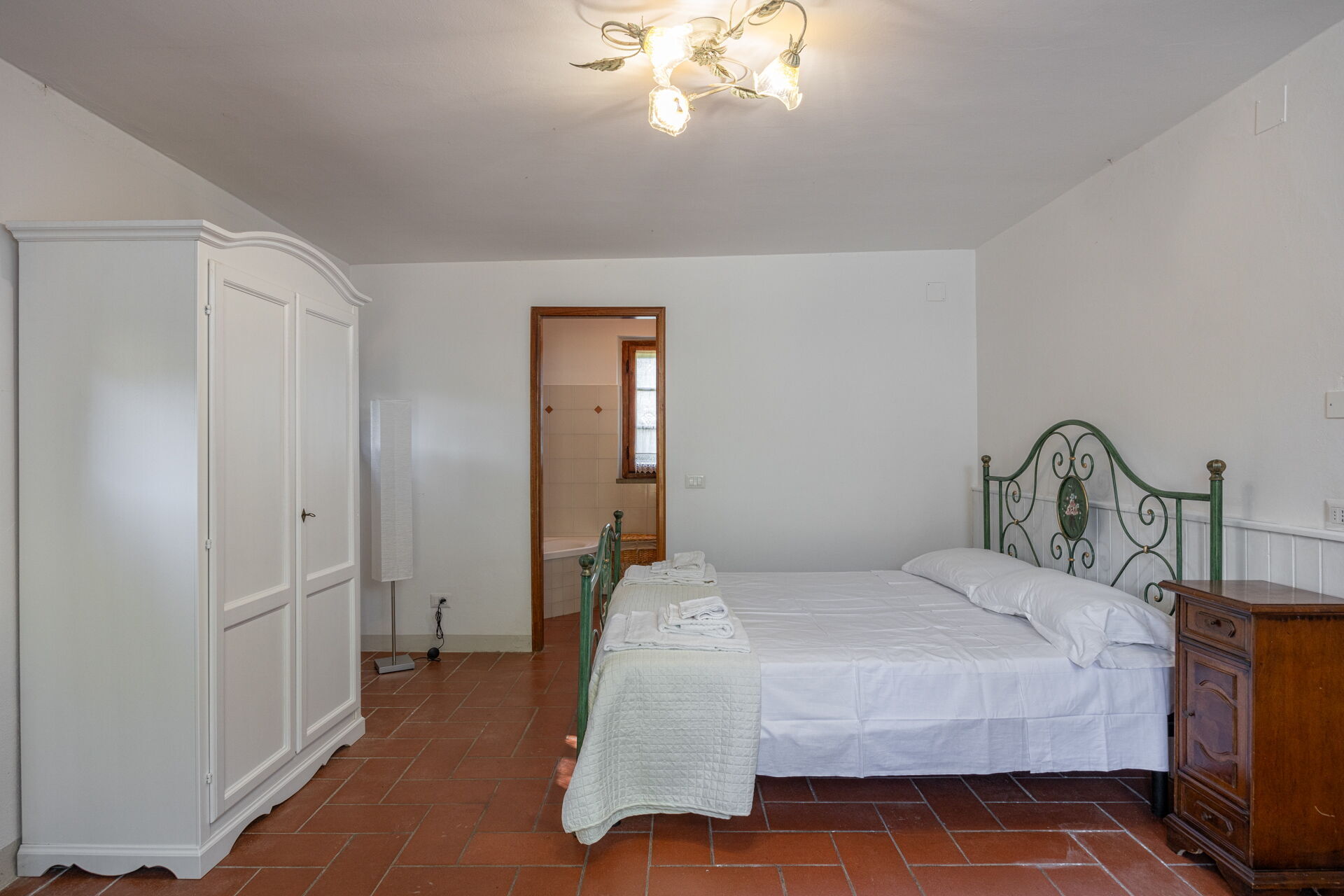 Schlafzimmer mit Bad: Doppelbett, WiFi Internet, Sofa, Sessel, Waschbecken, WC, Bidet, Badewanne, Fön, Ausgang auf den Garten.