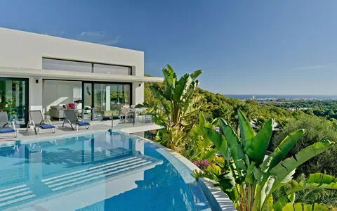 Sehr grosse, sehr moderne, komfortable Villa "Juno", auf 3 Stockwerken. Im Ortsteil Capsades, ruhige, sonnige Lage, 2.9 km vom Meer, 2.9 km vom Strand. Zur Alleinbenutzung: Schwimmbad beheizt (10 x 9 m, 40 - 190 cm tief, saisonale Verfügbarkeit: 01.Jan. - 31.Dez.) mit Meerwasser und Innentreppe. Ungleichmässige Schwimmbadform, Aussendusche, Pergola, Gartenmöbel, Grill, Parkplatz (für 6 Autos) auf dem Grundstück. Supermarkt 2.2 km, Restaurant 2 km, Café 2.5 km, Bushaltestelle 3 km, Sandstrand "El Arenal" 1.9 km, Steinstrand "La Granadella" 9 km, Felsstrand "Cala Blanca Segundo Muntanyar" 3.9 km. Sporthafen 2.2 km, Jacht-Hafen 2.2 km, Golfplatz (9 Loch) 4.8 km, Surfschule 2.2 km, Segelschule 2.2 km, Tennis 2 km. Der Besitzer akzeptiert keine Jugendgruppen.