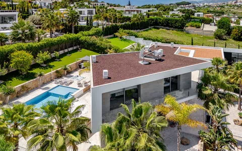 Sehr grosse, moderne, luxuriöse Villa "Eos", auf 3 Stockwerken. Im Ortsteil Cansalades Park Monte Olimpo, 5 km vom Zentrum von Jávea - El Arenal, 8 km vom Zentrum von Moraira, ruhige, sonnige Lage, 5 km vom Meer, 5 km vom Strand. Zur Alleinbenutzung: grosser, schöner, gepflegter terrassierter Garten mit Rasen und Pflanzen, Teich, Schwimmbad eckig, nicht einsehbar (10 x 4 m, 40 - 180 cm tief, saisonale Verfügbarkeit: 01.Jan. - 31.Dez.) mit Innentreppe. Aussendusche, Sprudelbad, Sitzplatz, Pergola, Gartenmöbel, Grill. Im Hause: Zentralheizung, Klimaanlage, Alarmanlage. Parkplatz (für 2 Autos, überdacht) auf dem Grundstück. Supermarkt 2.5 km, Restaurant 1 km, Bar 2.5 km, Bäckerei 2.5 km, Café 2.5 km, Bushaltestelle 5 km, Sandstrand "El Arenal" 5 km, Steinstrand "La Granadella" 10 km. Sporthafen 6 km, Jacht-Hafen 6 km, Golfplatz (9 Loch) 3 km, Surfschule 5 km, Segelschule 5 km. Bitte beachten: Fahrzeug empfohlen. Der Besitzer akzeptiert keine Jugendgruppen. Die Villa verfügt über ein zweites Innepool. Maße 4x2 mit Ausgang zur Terrasse.