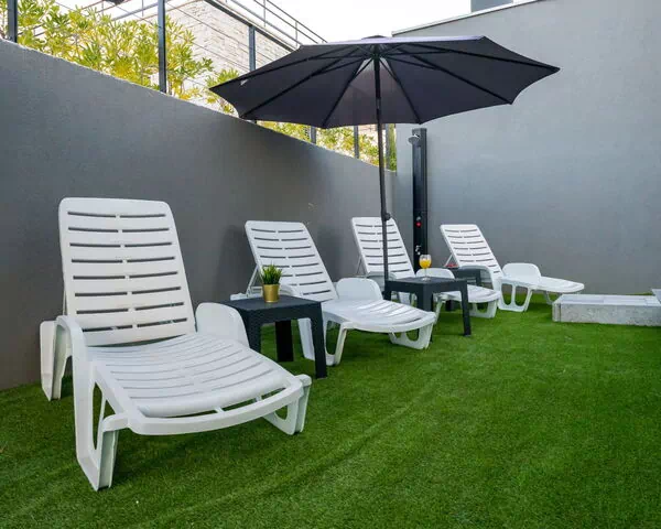 Das Ferienhaus verfügt über einen privaten Außenbereich von 50 Quadratmetern. Ein Whirlpool bietet eine luxuriöse Entspannungsmöglichkeit an warmen Sommerabenden wie auch in kühleren Nächten. Die erhöhte Position des Hauses am Hang verstärkt das Gefühl von Privatsphäre und Offenheit; der Sandstrand liegt nur 150 Meter entfernt und ist somit jederzeit für einen Morgenschwimm oder einen gemütlichen Nachmittag am Wasser erreichbar.