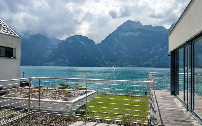 Sisikon 5 km von Brunnen: Komfortables, luxuriöses Einfamilienhaus "Villa am See 3", auf 4 Stockwerken. Im Ort, ruhige, sonnige Lage, direkt am See. Zur Mitbenutzung: Liegewiese. Badeplatz. Zur Alleinbenutzung: Garten. Grill. Im Hause: Tischfussball, Einstellraum für Fahrräder, Zentralheizung, Waschmaschine, Wäschetrockner, Fahrradverleih. Motorboot (auf Anfrage Absprache am Ort). Schmale Zufahrt bis zum Haus. Parkplatz (für 4 Autos) beim Haus, Einzelgarage. Einkaufsgeschäft 5 km, Lebensmittelgeschäft 5 km, Supermarkt 5 km, Bushaltestelle "Sisikon, Bahnhof" 200 m, Bahnstation "Sisikon" 200 m. Golfplatz (9 Loch) 6 km. Bekannte Seen in der Umgebung sind gut erreichbar: Vierwaldstättersee. Wandergebiete: Stoos, Weg der Schweiz, Rigi. Zur Vermietung (extra) vor Ort: Wassersportgeräte, Aussen-Sprudelbad, Boot, Fährräder und Gas für Gartengrill.