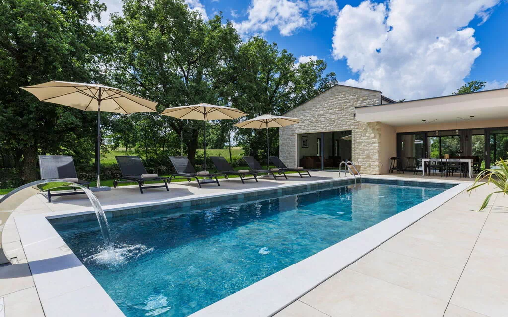 Freistehende, luxuriöse Villa "Ana", Baujahr 2023. In einem Weiler, 1.4 km vom Zentrum von Žminj, 25 km vom Zentrum von Rovinj, 25 km vom Meer. Zur Alleinbenutzung: Grundstück 7'200 m2, Schwimmbad eckig (10 x 3 m, 32 m2, saisonale Verfügbarkeit: 11.Mai. - 28.Sep.) mit Innentreppe. Aussendusche, Gartenmöbel, Grill. Im Hause: Internetzugang, Waschmaschine. Parkplatz (für 2 Autos) beim Haus auf dem Grundstück. Einkaufsgeschäft 1.4 km, Supermarkt 2.5 km, Restaurant 1.4 km, Bushaltestelle 1.7 km, Kieselstrand 25 km. Jacht-Hafen 25 km. Bitte beachten: Flugplatz 38 km vom Haus.