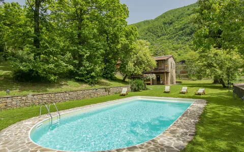 Grosser, gemütlicher Landsitz "La Moscella", 555 m.ü.M., Baujahr 1800, renoviert im Jahre 2006, umgeben von Bäumen und Wiesen. Zur Alleinbenutzung: naturbelassenes Grundstück 500 m2 (eingezäunt), wunderschöner Garten zum Entspannen, Schwimmbad (11 x 6 m, saisonale Verfügbarkeit: 15.Mai. - 30.Sep.). Aussendusche, Terrasse, Gartenmöbel, Grill. Koch möglich (extra). Im Winter bitte Schneeketten mitbringen. Parkplatz (für 6 Autos) auf dem Grundstück. Einkaufsgeschäft 5 km, Lebensmittelgeschäft 5 km, Supermarkt 5 km, Restaurant 5 km, Bar 5 km, Bäckerei 5 km, Bushaltestelle 600 m. Nahe gelegene Sehenswürdigkeiten: Parco Nazionale dell' Orecchiella 3 km, La Fortezza delle Verrucole Archeo Park 4 km, Parco Avventura Il Buffardello 3 km. Bitte beachten: Fahrzeug empfohlen. Babyausstattung auf Anfrage (inkl.).