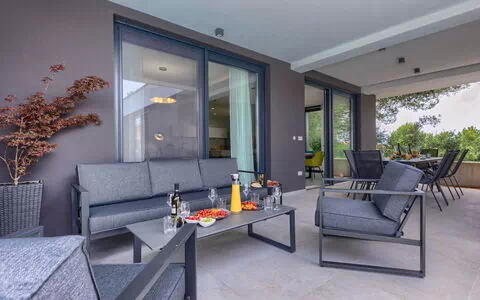 Moderne Villa "Nika", auf 2 Stockwerken. 1.5 km vom Zentrum von Medulin, 10 km vom Zentrum von Pula, sonnige, erhöhte Lage, 1 km vom Meer, 1.5 km vom Strand, in einer Sackgasse. Zur Alleinbenutzung: Grundstück 750 m2, Garten mit Rasen und Bäumen, Schwimmbad eckig, beheizt (13 x 4 m, 140 cm tief, saisonale Verfügbarkeit: 01.Apr. - 01.Nov.) mit Innentreppe und Salzelektrolyse-Reinigungssystem. Aussendusche, Terrasse (15 m2), Gartenmöbel, Grill, Poolpflege durch den Besitzer/Gärtner. Im Hause: Internetzugang, Sauna, Massage (extra). Sprudelbad, Wellnessbereich, Klimaanlage, Waschmaschine. Parkplatz (für 3 Autos, überdacht) beim Haus auf dem Grundstück. Einkaufsgeschäft 1 km, Supermarkt 1.5 km, Restaurant 500 m, Bushaltestelle 750 m, Sandstrand 1.5 km, Kieselstrand 1.5 km, Felsstrand 1.5 km. Surfschule 2 km, Reitstall 1 km, Wanderwege ab Haus 100 m, Radweg 150 m. Nahe gelegene Sehenswürdigkeiten: Amphitheater 10 km. Der Besitzer akzeptiert keine Jugendgruppen. Schwimmbad beheizt (extra), mit Gegenstromanlage und Hydromassage. Es ist notwendig 7 Tage im Voraus bekannt zu geben, ob die Schwimmbadheizung eingeschaltet werden soll. Videoüberwachung der Immobilie.